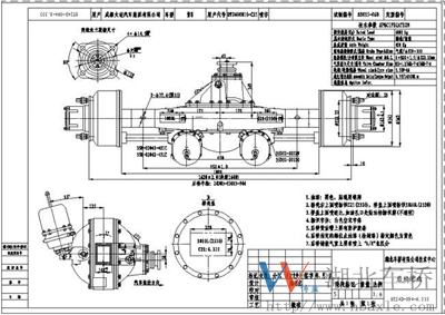 2402D094-010-6.33 主減速器總成噪音低,傳遞扭矩大。主減速器總成計(jì)突緣端面至橋殼中心線距離為349mm(見如下安裝尺寸圖)。主、從動(dòng)錐齒輪是專門針對(duì)客車要求噪音低、壽命長(zhǎng)等特點(diǎn),其傳遞扭矩16500N.M,裝配成總成后噪音在86dB以下,壽命可達(dá)70萬次以上,深受用戶的好評(píng)。